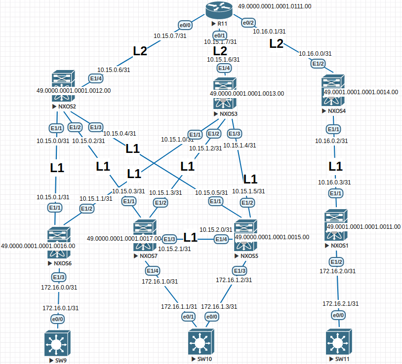 NXOS2 and NXOS3 operate in IS-IS area 0 (0000), and the Leaf nodes below them belong to the same area. R11 is the inter-area router residing in area 0 and forwarding routes toward NXOS4 in area 1 (0001). Routes follow the topology as shown on the diagram; Loopback addresses are redistributed at L1/L2 to avoid tracking individual connected networks.